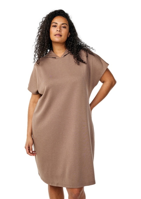Wygodna sukienka z kapturem w beżowym odcieniu