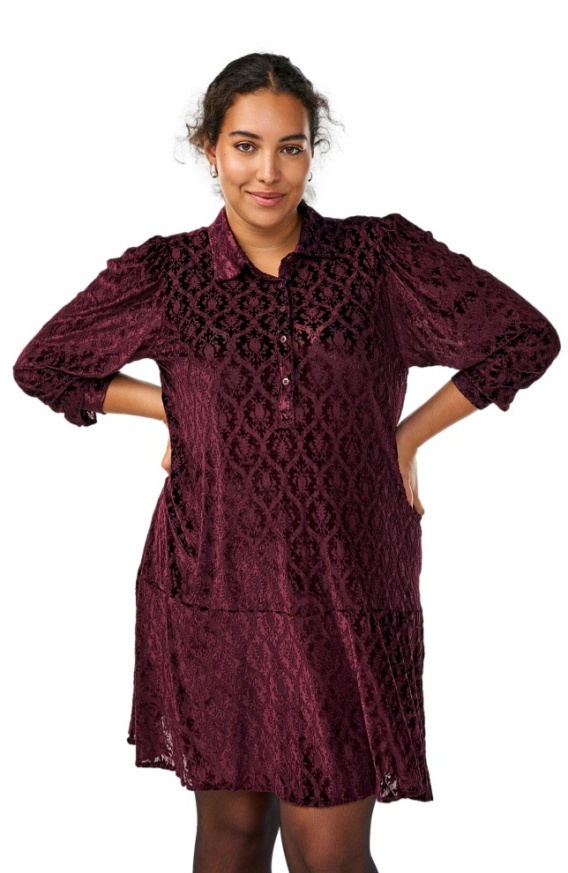 •  Elegancka sukienka w odcieniu głębokiego fioletu z aksamitnym wzorem
